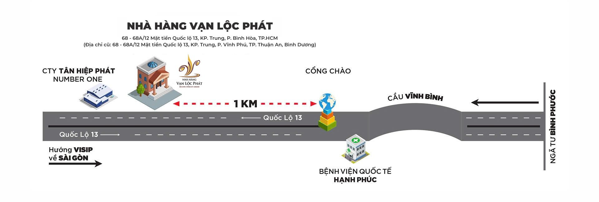 Nhà hàng Vạn Lộc Phát ngụ tại địa chỉ đắc địa số 68 - 68A/12 Mặt tiền Quốc lộ 13, Khu Phố Trung, P. Bình Hòa (P. Vĩnh Phú, TP. Thuận An, Bình Dương cũ), TP.HCM. Đây là địa điểm thu hút rất nhiều thực khách tìm đến thưởng thức ẩm thực và thư giãn. Với không gian thoáng, rộng, đẹp Nhà hàng Vạn Lộc Phát là địa điểm được quý khách chọn lựa là điểm đến cuối ngày, cuối tuần cho gia đình và tiếp đãi bạn bè, đối tác.
