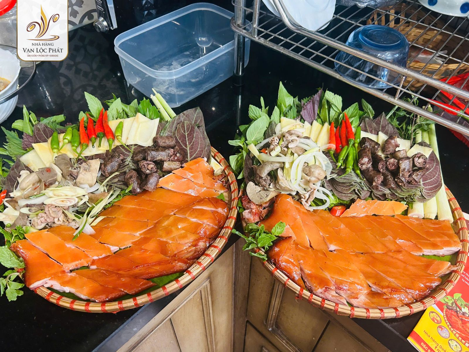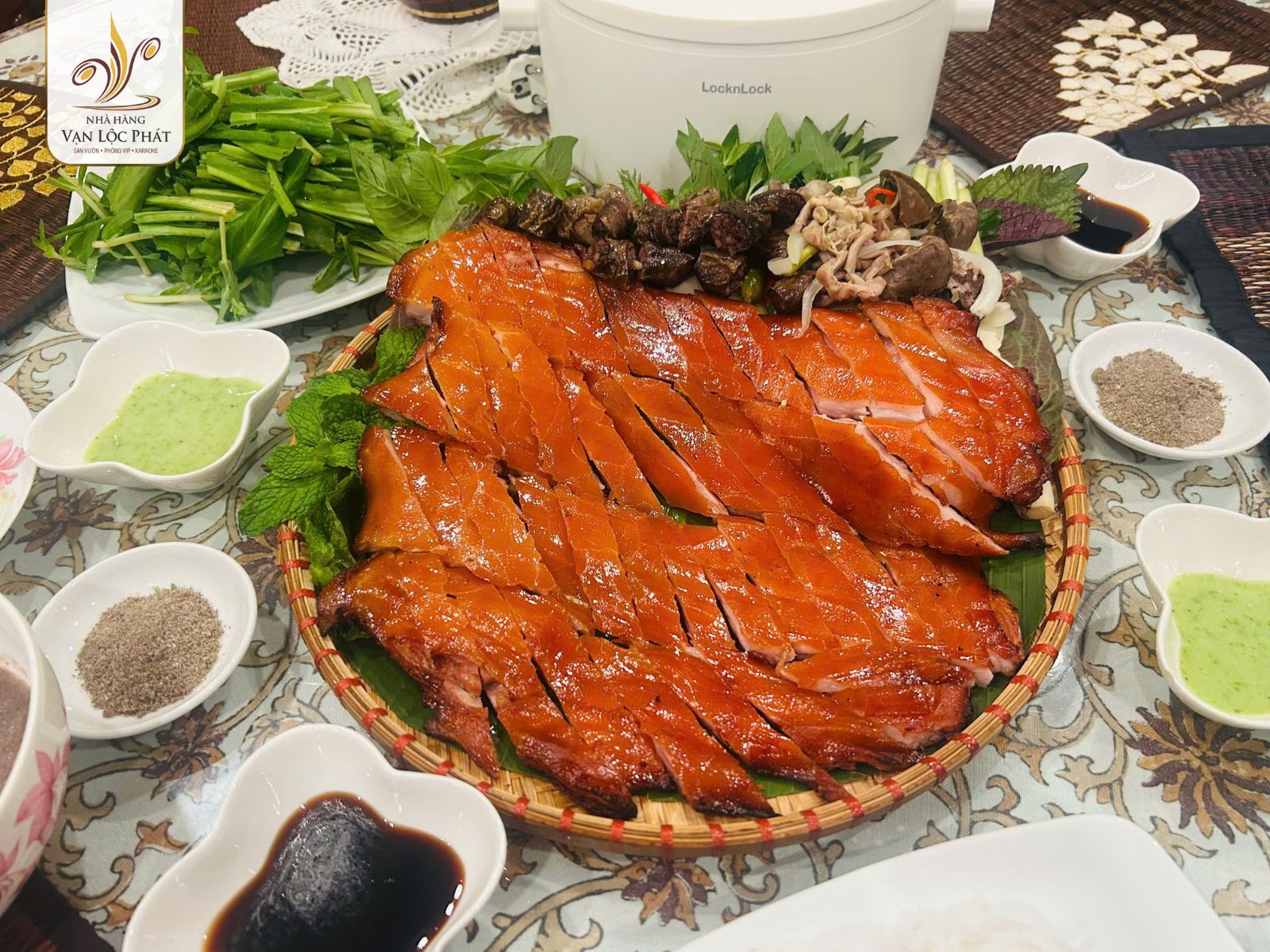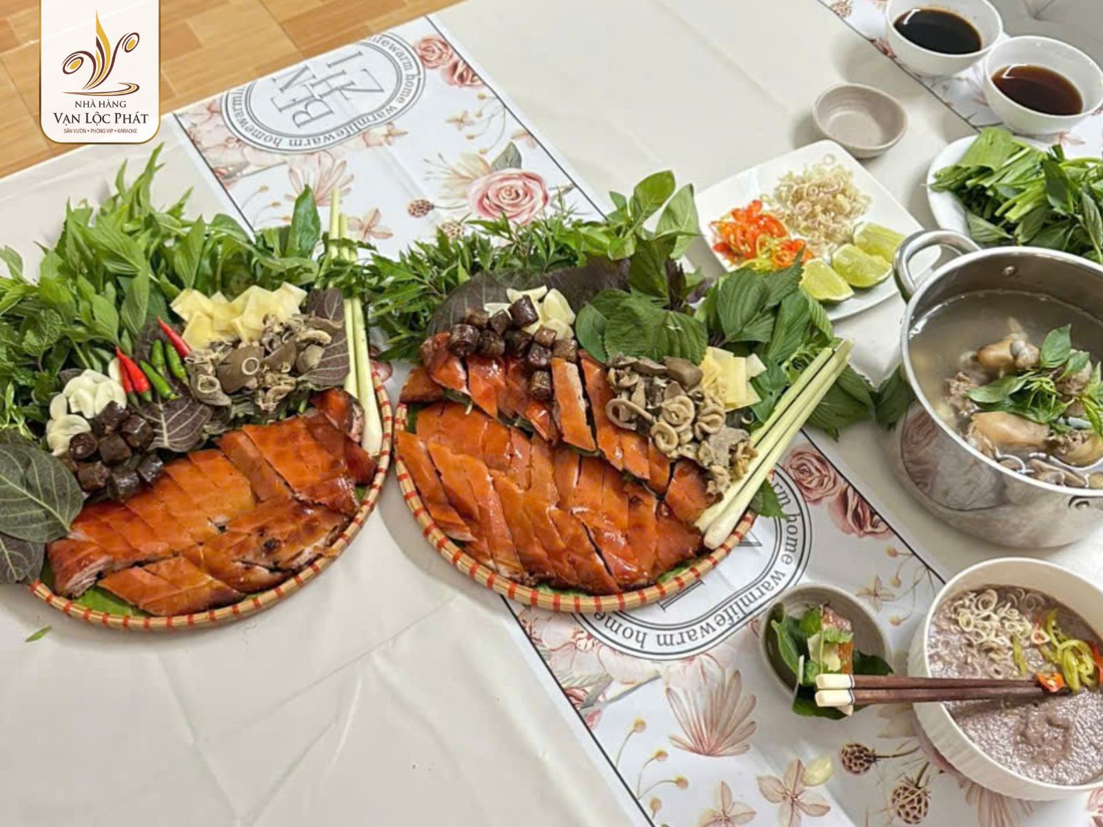 Tại Vạn Lộc Phát, chúng tôi không chỉ mang đến một món ăn ngon mà còn kiến tạo một trải nghiệm ẩm thực hoàn chỉnh. Món Đệ Nhất Heo Tộc Quay Lu Chặt Mẹt khi ra lò sẽ được bày biện khéo léo trên mẹt tre lót lá chuối xanh mướt, một hình ảnh mộc mạc nhưng đầy cuốn hút. Ăn kèm là các loại rau thơm tươi rói của làng quê Việt và chén mắm tôm được pha chế đặc biệt, tất cả hòa quyện tạo nên một bản giao hưởng hương vị khó quên.