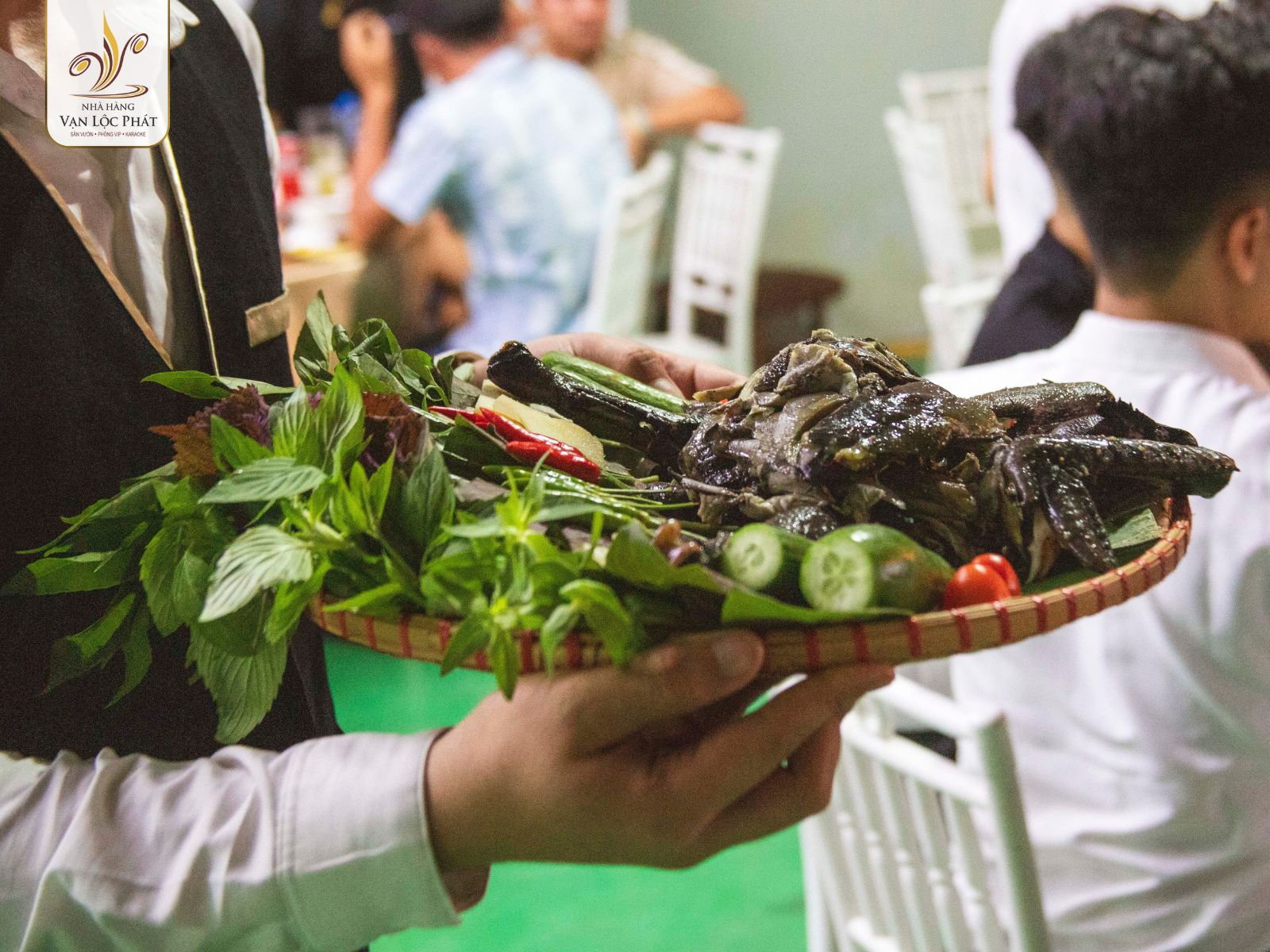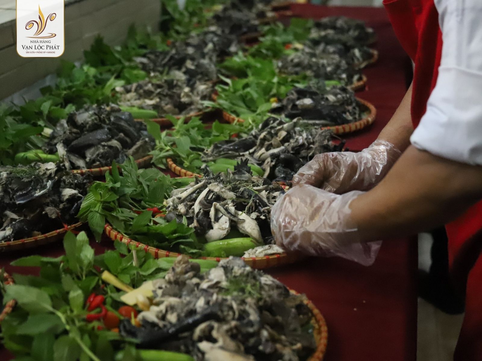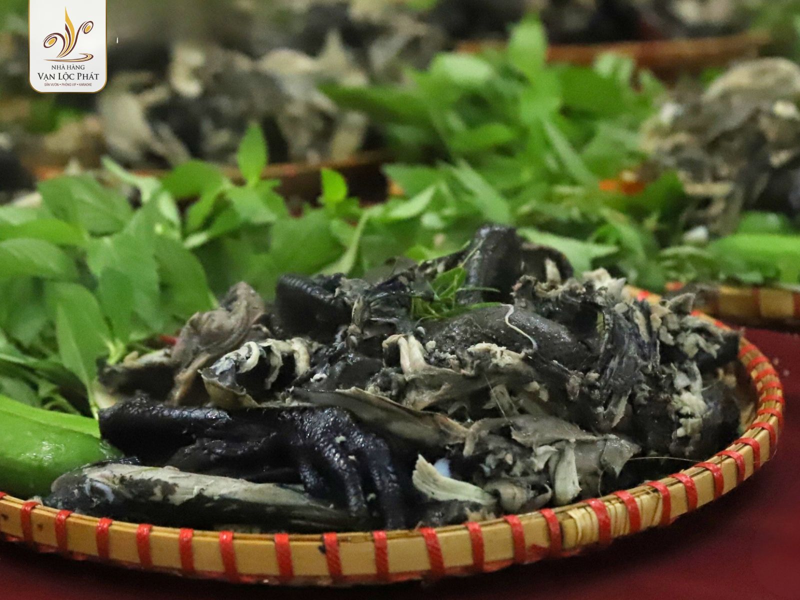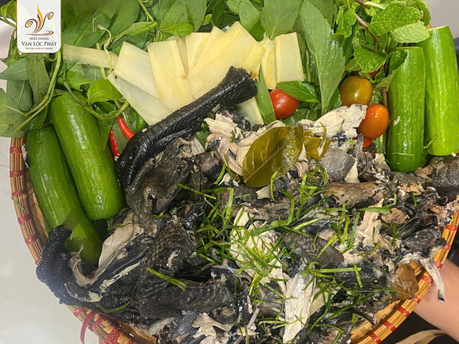 Ngoài việc chú trọng đến chất lượng và hương vị, Vạn Lộc Phát cũng rất chú trọng đến cách trình bày món ăn. Gà Đen Bản Tây Bắc được bày biện tinh tế trên mẹt tre, kèm theo rau rừng tươi ngon, tạo nên một bức tranh ẩm thực hài hòa từ màu sắc đến hình thức.